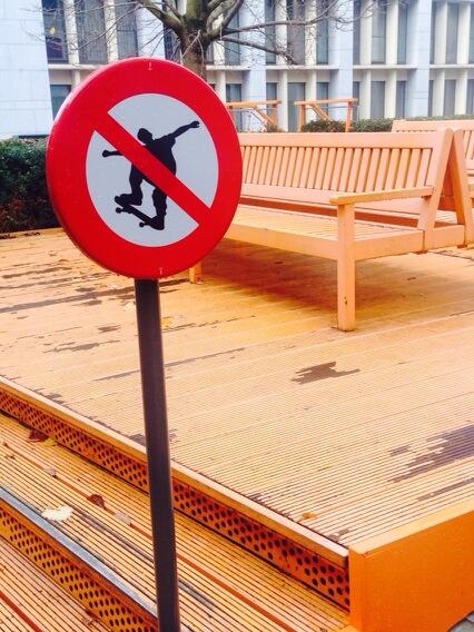 Zelf werk ik in het Vlaams Parlement in Brussel. Sedert enkele maanden staan aan mijn kantoorgebouw langs de Leuvenseweg verbodsbordjes met een pictogram van een skater op. De nieuwe bordjes staan voor de oranje banken aan het Huis van de Vlaamse Volksvertegenwoordigers, net niet onder het beroemde oranjerode nest van Arne Quinze (zie https://peterdejaegher.wordpress.com/2013/09/25/de-sequence-krijgt-sequel-als-spaanderplaat/). Vindt het Vlaams Parlement misschien ook dat kinderen niet op openbaar terrein mogen spelen?