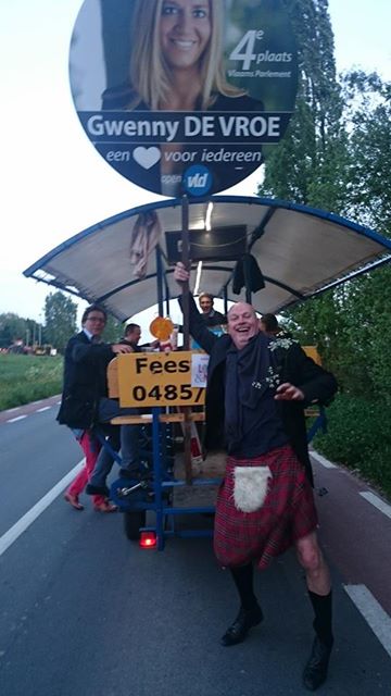 door het sociale medium naar een foto van een kale man in een bordeaux geruite rok met zwarte half afgezakte kousen aan. Uitdagend en breed lachend poseert hij voor een vreemd overdekt voertuig waarop verschillende passagiers plezier zitten maken. Zijn hand rust op een paal waarop een verkiezingsbord van Gwenny is bevestigd. Het voertuig was een zuipkar, zag ik aan de trappers onder de kar, waarmee mannen wel eens de hort op gaan als ze iets te vieren hebben.