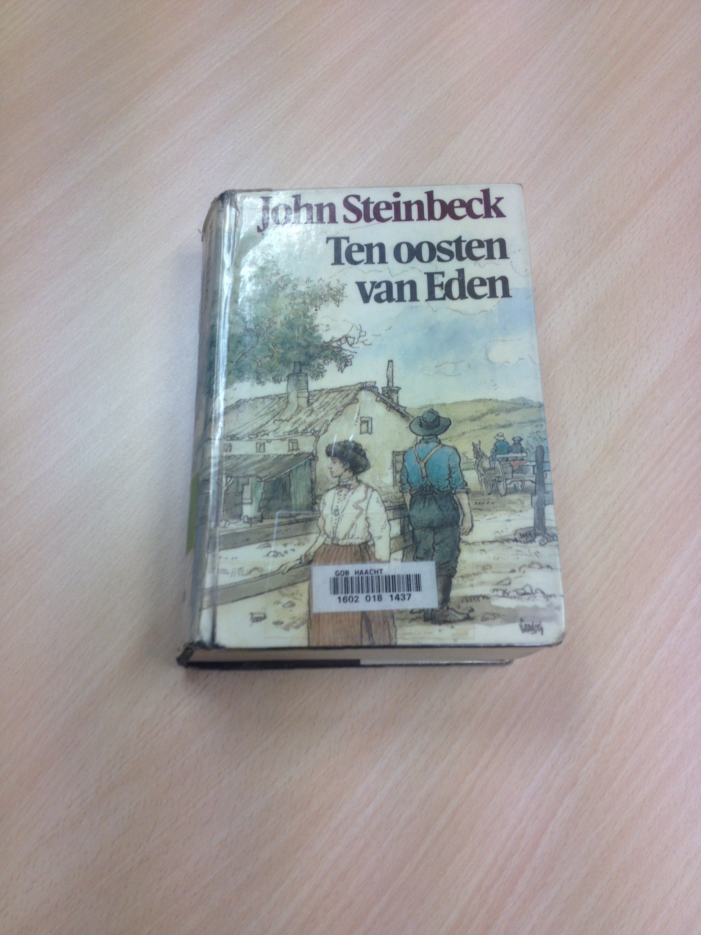 stuk in de bib waren uitgeleend, toch Ten oosten van Eden. Ook omdat mijn dochter Winke het gelezen had. Zij wist me zonder veel woorden duidelijk te maken dat ze het bijzonder mooi vond. Ofschoon ik aanvankelijk nukkig struikelde over de oude spelling, blies na enkele bladzijden het magnum opus van John Steinbeck uit 1952 me helemaal van mijn sokken.