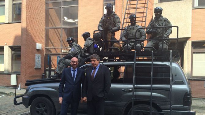 hoogwaardigheidsbekleders en belangrijke mensen. Veel politici dus ook. Zoals Charles Michel en Jan Jambon. Onze premier die zich liet filmen terwijl president Obama hem telefonisch feliciteerde met de vangst van Salah. Onze minister van Binnenlandse Zaken die zich met Michel liet fotograferen voor een jeep vol gemaskerde speciale interventietroepen in vol ornaat met daarbij de tweet: You got him, boys! So proud of you. Together we can fight terrorism. Een N-VA’er in het Engels dus, pour les besoins de la cause, jawel, alsof het om een EK-wedstrijd ging die België heeft gewonnen.