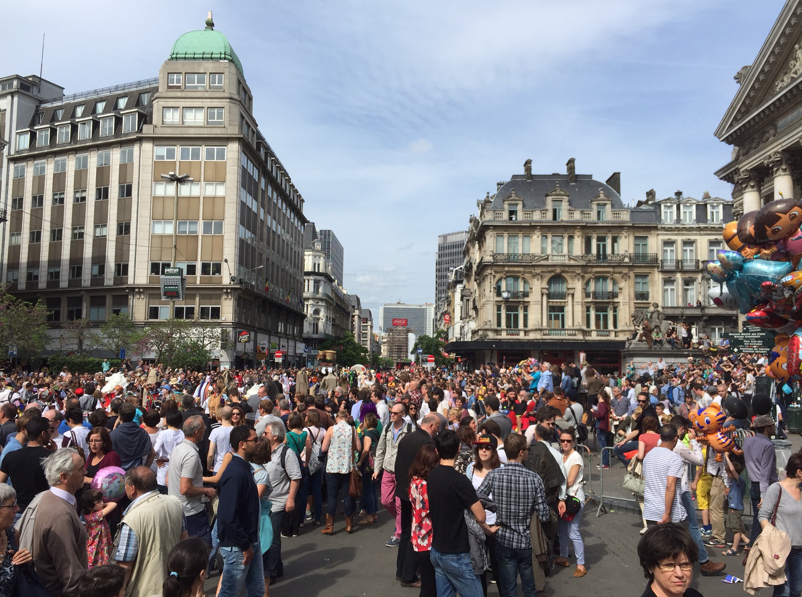 maar, in afwachting van te gaan lopen, want het regent. En er hangt nog een kater in mijn hoofd, opgelopen in café De Boerkes in Jette. De parade is voorbij. Maar ik heb ze gezien, de zinnekes vol goesting om hun dansjes te laten zien, te pronken met hun kostuums. Ze waren fier, klein en groot, jong en oud, Nederlands- en Franstalig. Het publiek genoot zonovergoten. Where are all the soldiers, vroeg ik me luid af in de massa, in de lingua franca waarmee Greet en ik en ons gezelschap van twee Roemeense en een Nederlandse ons aan elkaar verstaanbaar maken. We hebben ze in de metro gestopt, antwoordt een piekfijn uitgedost ouder heertje dat verdacht veel op Tony Mary lijkt. Het collectief moment collectif hebben we gemist. Toen zaten we al in Café Le Fontainas, temidden de homo’s, de lesbo’s en de hetero’s, niet op het terras maar binnen. Alle terrassen zaten vol. Vroeger, vóór de tussentijd, zou me dat hebben geërgerd, gisteren was ik daar heel gelukkig mee. Nog geen nieuws van het vliegtuig van Egyptair, maar de zon komt piepen, hoog tijd om te gaan lopen.