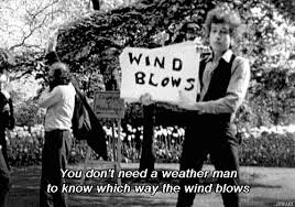 Als je even niet op de naam van het nummer komt, volstaat het een Dylankenner te vragen: hoe heet dat liedje weer met de bordjes en die weerman? Subterranean Homesick Blues dus. Die videoclip-achtige bordjes zijn voor het eerst te zien in de film “Dont look back”. De weerman slaat op het gezegde, geboren in dit liedje, dat je geen weerman nodig hebt om te weten van waar de wind waait.