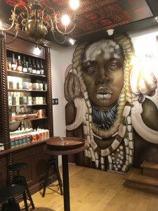 De op een Afrikaanse koningin lijkende vrouw achter de toog geeft een ontwijkend antwoord op mijn vraag naar haar lekkerste koffie. Ik verwacht me een aan opsomming van soorten bonen en exquise bereidingen. Coffeebar Aksum soest halverwege de ochtend nog heerlijk rustig. Rond me zie ik veel koffie in zakken, een heerlijke taartenstandaard en koekjesstalling, een Afrikaans masker, prachtige muurschilderingen van Afrikaanse mensen in traditionele hoofdtooi en wilde dieren in de vrije natuur.
