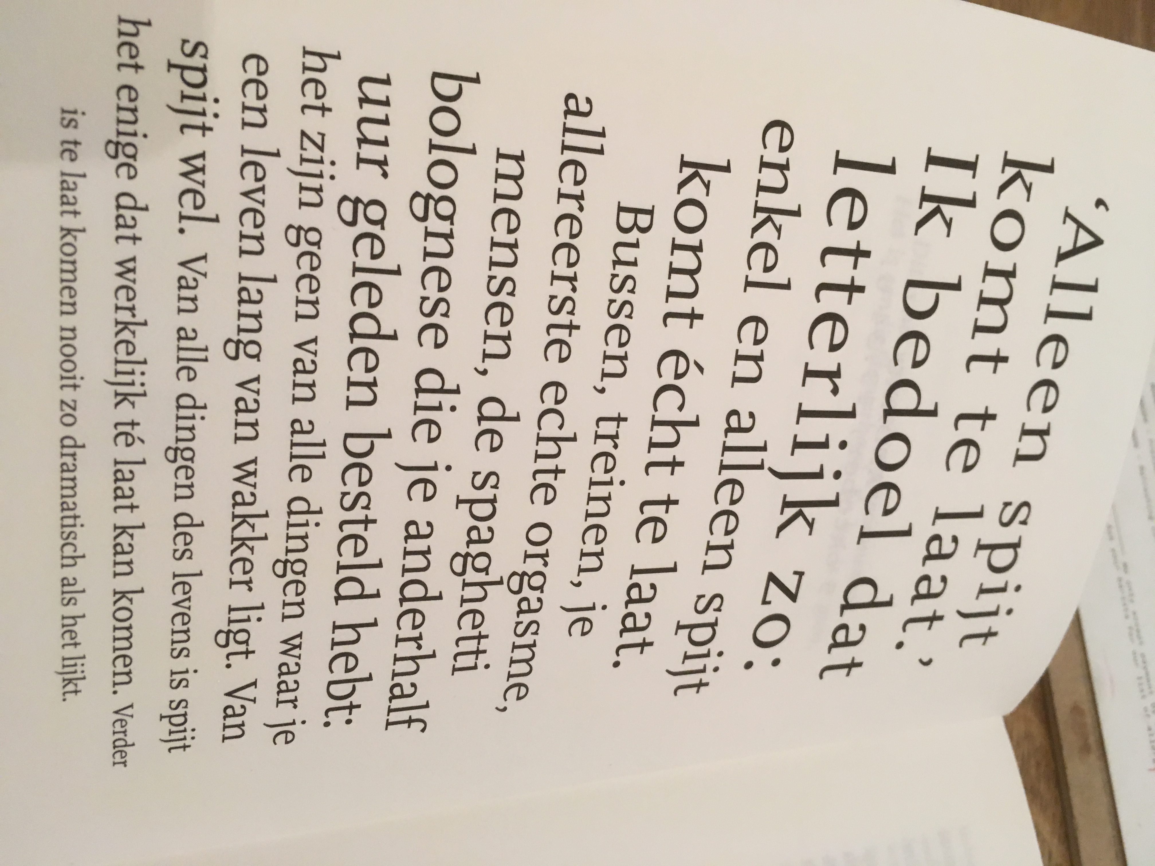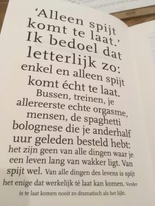 aangenaam. Zoals het in het boek staat waarin ik inmiddels ben beginnen lezen: ‘alleen spijt komt te laat. (…) Bussen, treinen, je allereerste echte orgasme, mensen, de spaghetti bolognese die je anderhalf uur geleden besteld hebt: het zijn geen van alle dingen waar je een leven lang van wakker ligt. Van spijt wel. Van alle dingen des levens is spijt het enige dat werkelijk té laat kan komen. Verder is te laat komen nooit zo dramatisch als het lijkt.’