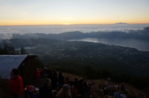 We zien de horizon in het oosten al oplichten in het morgenrood. Beneden blinkt het langgerekte Baturmeer, het grootste meer van Bali, nog in het maanlicht. Recht voor ons houdt de Abang zich koest. We zitten boven de wolken. Achter de wolken kunnen we de zee zien, met in de verte de vulkaanbergen van het volgende oostelijk gelegen eiland van de Indonesische archipel, Lombok. Op dat moment weet nog niemand dat binnenkort drie aardbevingen op enkele dagen van elkaar er een paar honderden doden zullen maken.