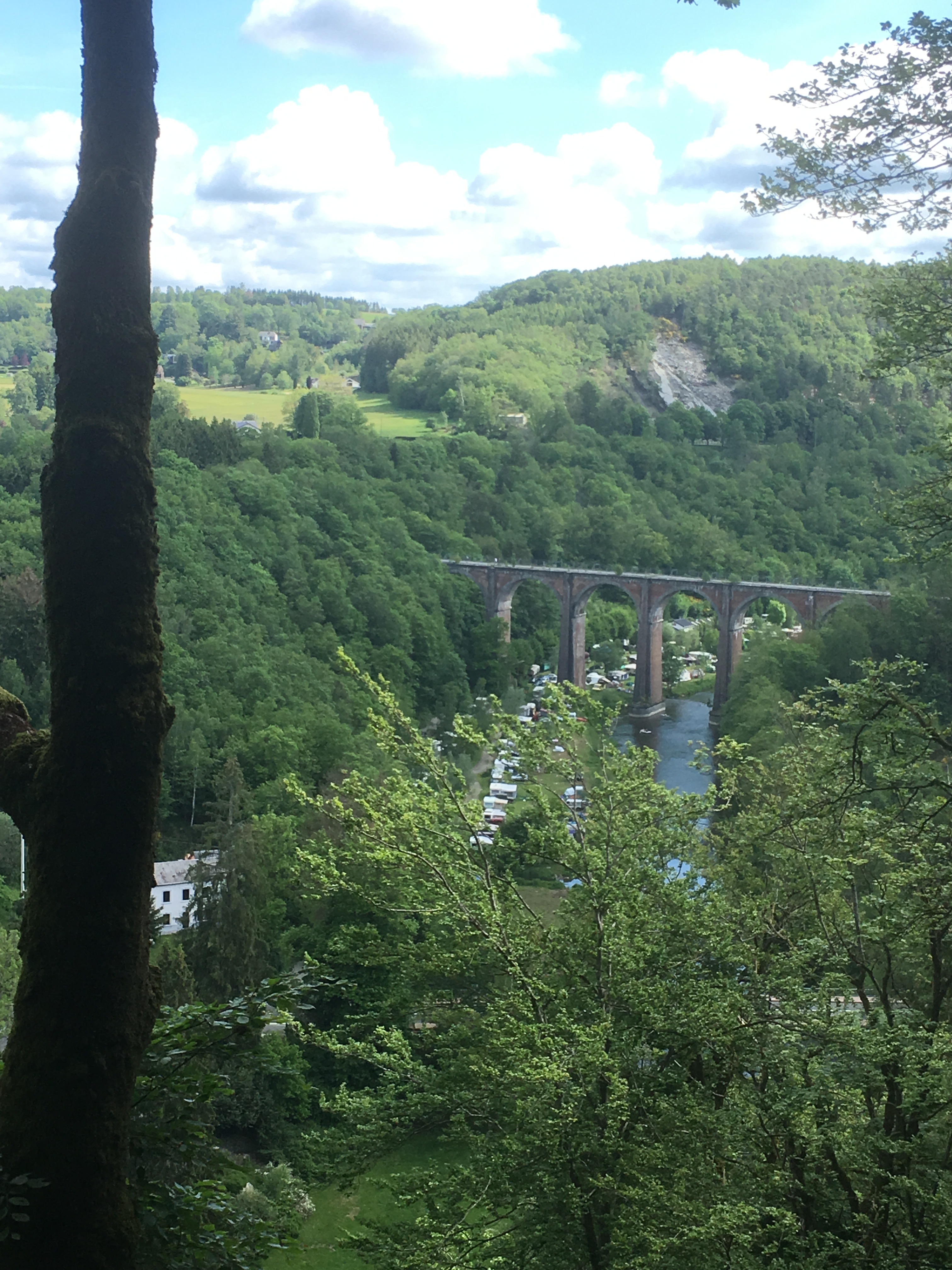 mobilhomes in Herbeumont. Een boogscheut verderop ligt de Ravel, een oude spoorlijn die nu bewandelbaar is gemaakt. Wat verder loopt de Ravel over een viaduct over de Semois en de camping van Arno, Champ le Monde. Inderdaad complet, ziet de Grijze Man uit de hoogte.