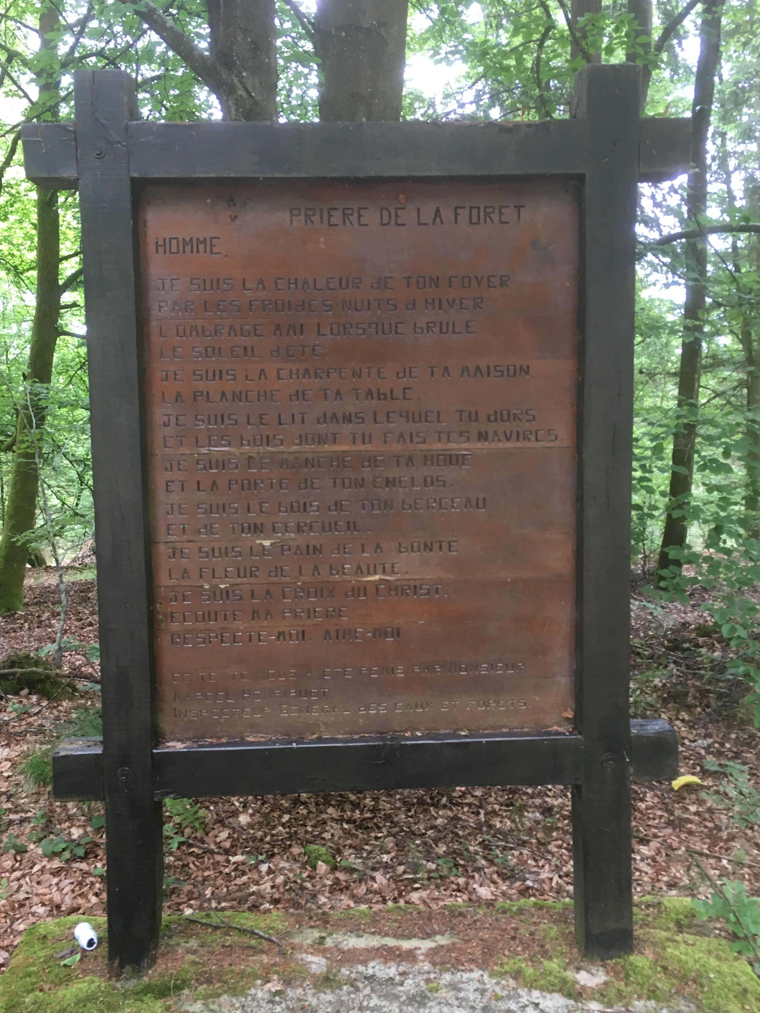 bord waarin een Prière de la Forêt, een Gebed van het Woud, is gebeiteld. De tekst bewierookt het bos als grote dienaar van de mens. Het gebed was duidelijk geschreven in tijden dat huizen nog in hout werden opgetrokken, haardvuur die huizen verwarmde, de mens sliep en at op houten constructies, er zijn gerief in opborg, en er, na de verlossing uit zijn baarmoeder en nog eens na het geven van zijn geest, doorgaans voorzichtig werd in gelegd. Een gebed uit een periode dus, waarin de mens werd bijgebracht dat hij veel aan God te danken had. En maar best voor de katholieke partij stemde. cultuur van lang geleden dus, bedenkt de Grijze Man. Toen mensen er nog konden toe gebracht worden in een gebed dank te zeggen voor zo’n goddelijke schepping als het woud en een van zijn voortbrengsels, het hout, naar de mis gingen en voor de katholieken stemden. Maar toch genoot de Grijze Man van het gedicht. Want hoe dringend is het niet vandaag om respect te tonen voor het bos? Om het bos te beschermen?