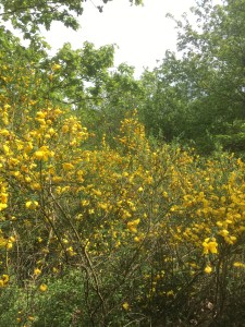 Teruglopend langs de Ravel naar de pleisterplaats voor mobilhomes vallen de Grijze Man weer de verlokkelijke goudgele bremstruiken op. Hier en daar bloeien ook kleine blauwe bloemetjes. Zijn het vergeet-me-nietjes? Dat moet hij nog eens uitzoeken. Rode of oranje bloemen heeft de Grijze Man alleszins niet opgemerkt.