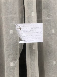 Wat verder in de straat staat een verwaarloosd huis dat nog bewoond is. Aan de binnenkant van het raam voor een wit gordijn dat smeekt om gewassen te worden, hangt op een gescheurd papiertje in halfvergane letters een kattebelletje voor de passanten. In het Frans en het Engels worden zij bedankt om het venster niet aan te raken, zelfs niet als ze de kat lief vinden.