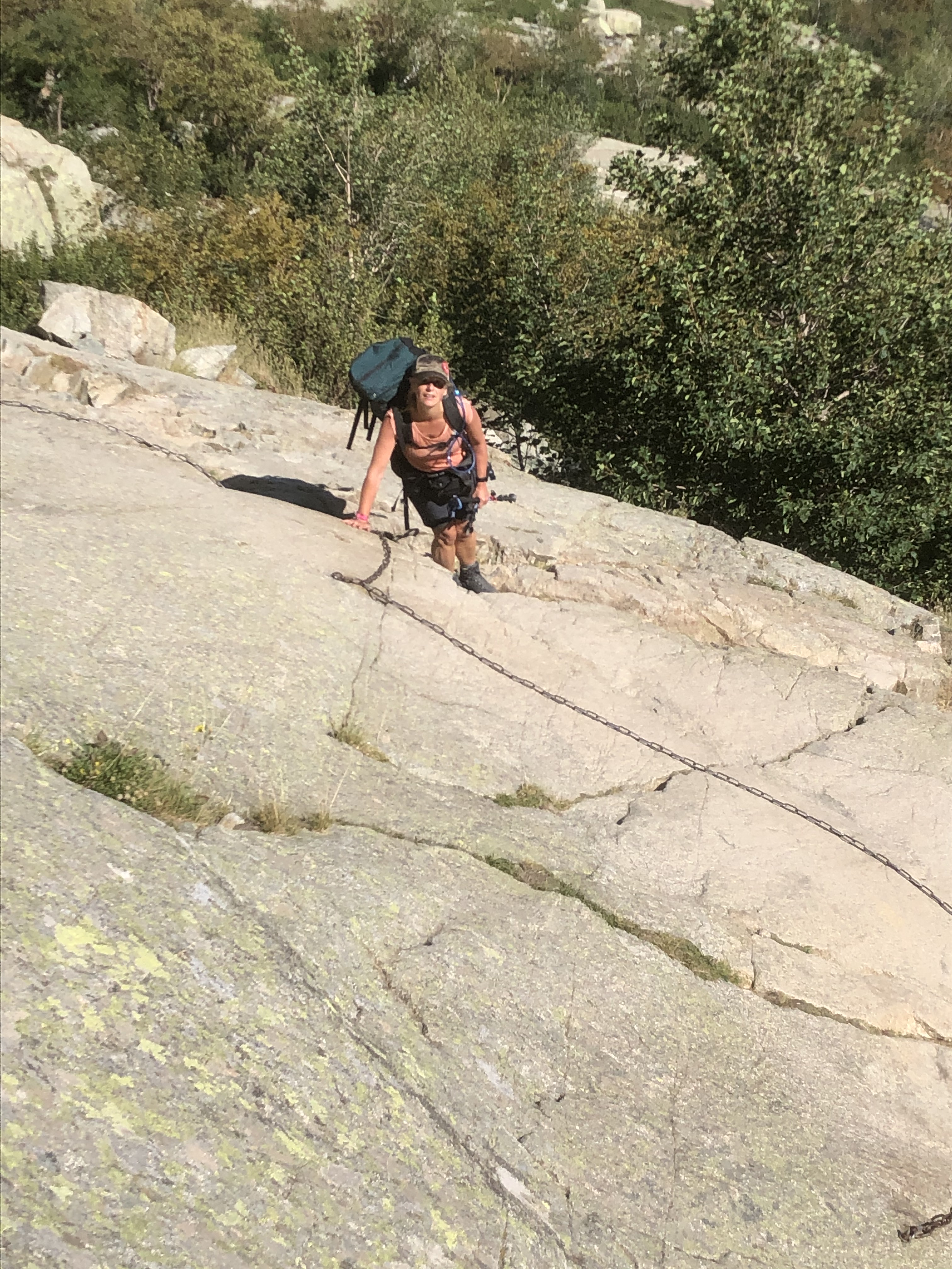 Bij een pauze zag ik een rugzak naderen die van links naar rechts schommelde: ongelijke schouderriemen en een te losse heupriem. De rugzak deftig fitten was de eerste dringende les, toen we langs kettingen en enkele laddertjes omhoog moesten om de kam van de vijver van Melo te ronden. Daarna volgde nog een klim tot de Bocca di Soglia, waarmee we op tweeduizend meter hoogte op de GR20 kwamen en het gros van onze klimmeters voor de eerste dag in de benen hadden. Die al beurs voelden van vermoeidheid.