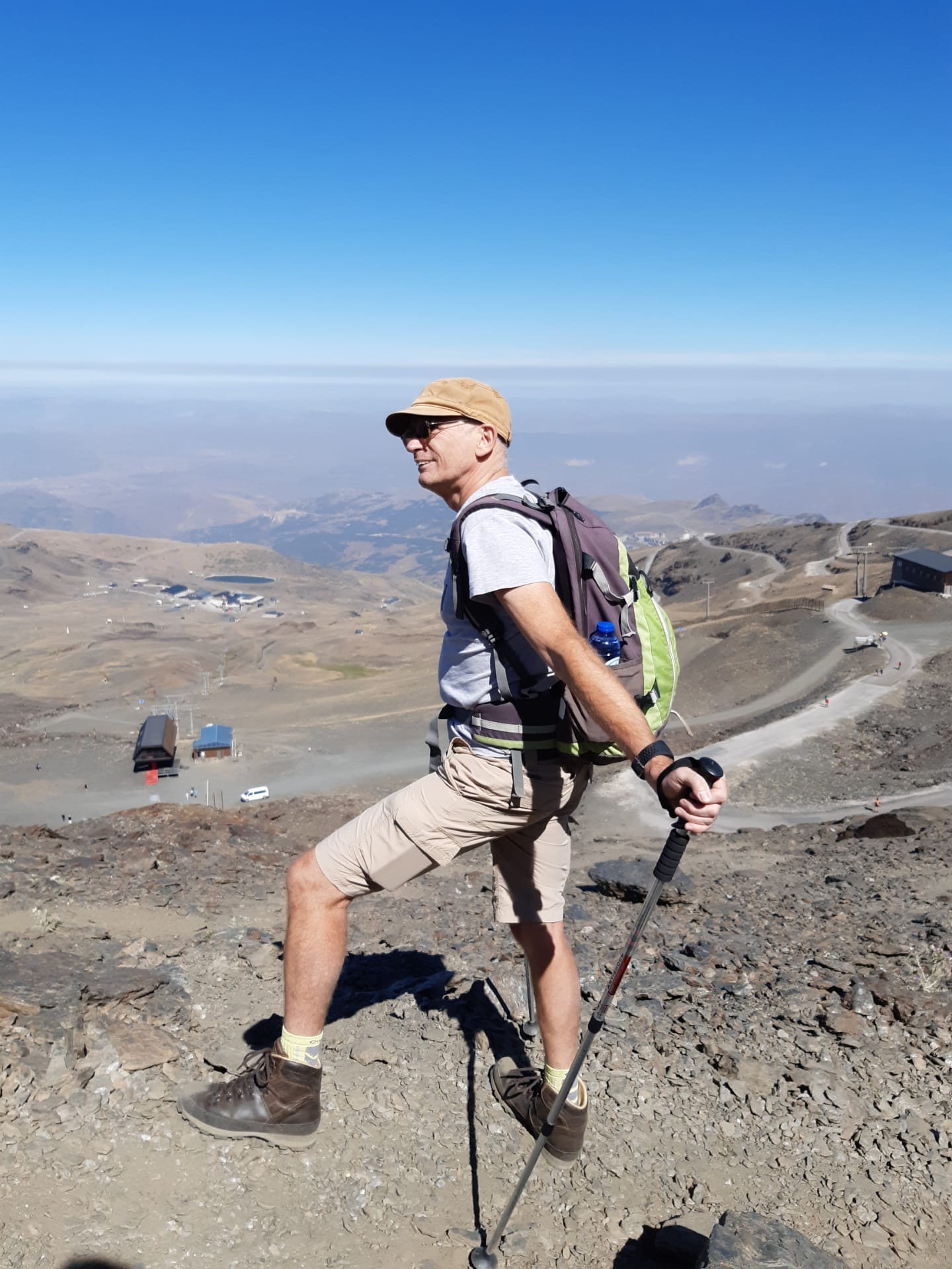 Boven maakten we mooie foto’s. Het was druk op de top. Vooral Spanjaarden die aan staycation deden. En er waren niet alleen wandelaars aan het verpozen, ook mountainbikers hebben tegenwoordig een eigen parcours tot op enkele meters van de betonnen paal die de top van deze populaire berg in de Sierra Nevada markeert.