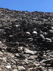 steenpuinvlakte af. Ik voelde een vervelende hoofdpijn opkomen en dorst die niet meer te lessen viel. We moesten nog duizend meter dalen. Gelukkig leidde het landschap me wat af. Beneden aan de puinvlakte zagen we groene weiden en wat mensenstipjes rond twee bergmeertjes zitten picknicken.