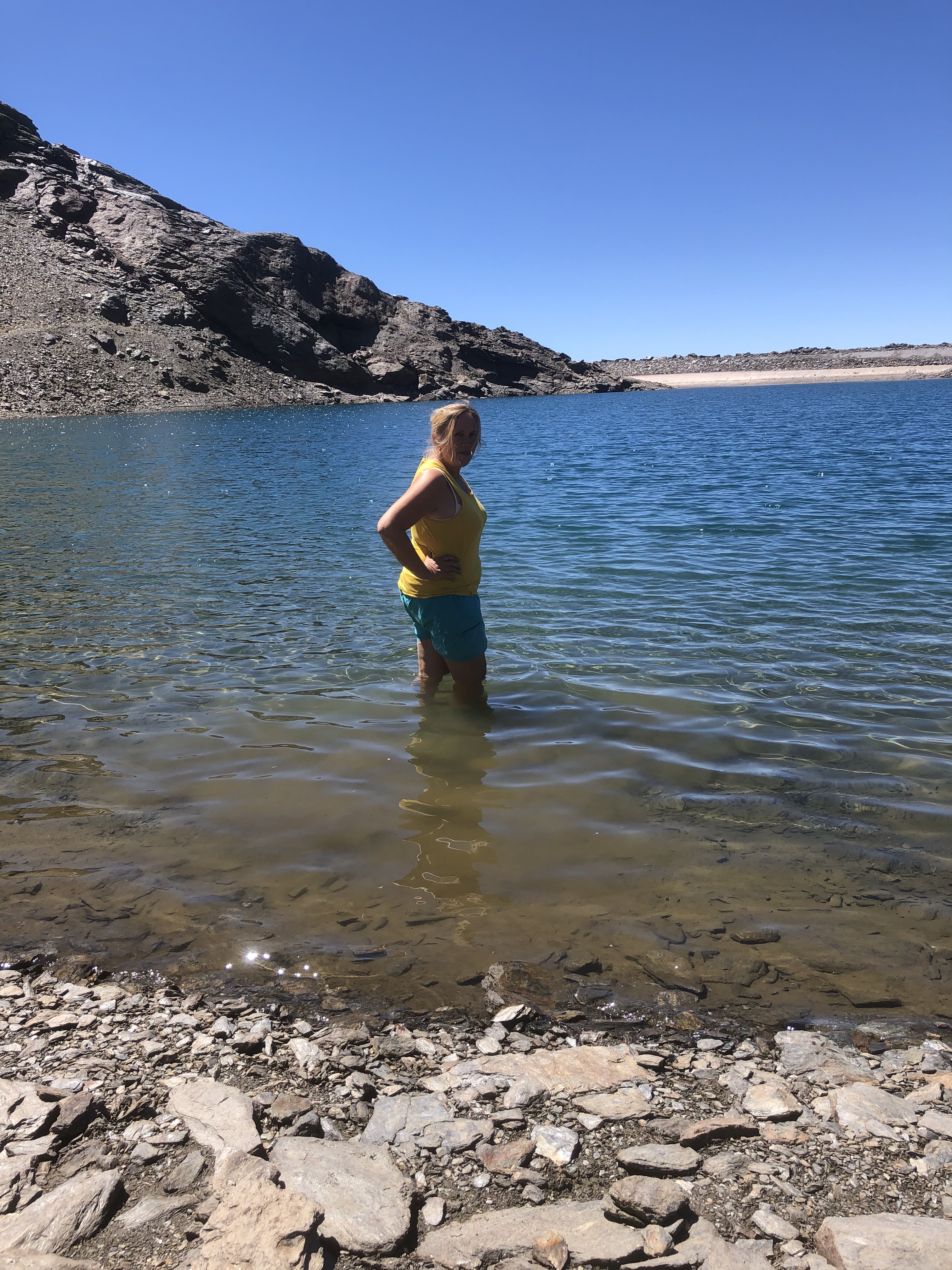 Op het einde van de steile afdaling door het puin greep Marianne me bij mijn kladden. ‘Daar zou ik nu wel eens even willen rusten’, wees ze naar de aanlokkelijke meertjes, die intussen met drie waren. ‘Het zal je hoofdpijn ook wat verlichten’, voerde ze nog aan, een argument dat hout sneed. Dus zaten we een half uurtje later aan de rand van een bergmeertje, waar ze lustig pootje baadde. Ik verbeet in stilte mijn lijden.