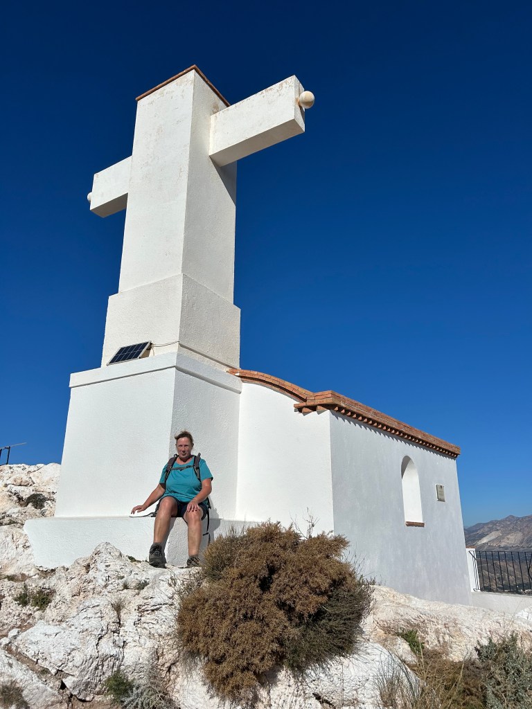 Het pad was vrij breed, met stenen bezaaid, af en toe plat, maar doorgaans steil tot heel steil. Veel wandelaars waren al vroeger op pad als wij, en kruisten ons in de afdaling. Boven kregen we al van ver de witgeverfde Ermito in de gaten. Een lange sliert ouden van dagen in een hemelsblauwe fleece gehuld met de naam van hun wandelclub op geborduurd, daalde net de trappen af die van het monument naar het bospad leiden. Op de top zat een verliefd koppel van middelbare leeftijd op de rand van de daar gelegen era, de ronde stenen vloer waarop de Moren vroeger dorsten, elkaar te zoenen. Daar hielden ze prompt mee op toen wij de brooddozen met onze lunch uit onze tochtrugzakken haalden.