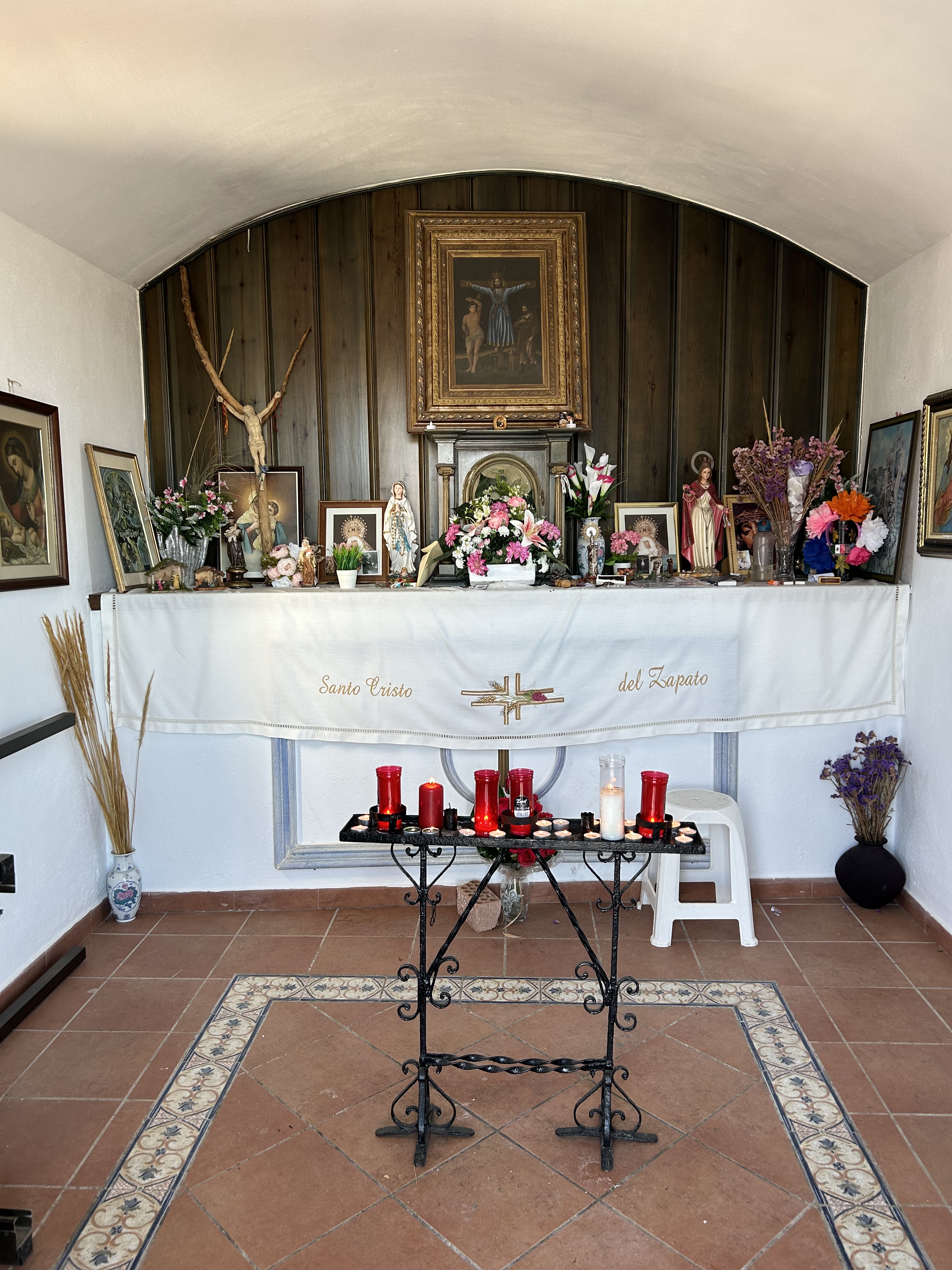 Bij een eerder bezoek met vrienden aan Pinos, vatten we het plan op om die beroemde wandeling naar de Ermito del Santo Cristo del Zapato, waar het schilderij of alleszins een kopie ervan hangt, eindelijk eens te doen. De klim van de berg Chinchirina is steil, maar de afstand valt met 5 kilometer best mee. Daarom breide Marianne een tweede stuk aan de wandeling, die ons met een totaal van zo’n 12 kilometers en een 800 hoogtemeters terug aan de parking in Pinos zou brengen waar we onze auto hadden achtergelaten.