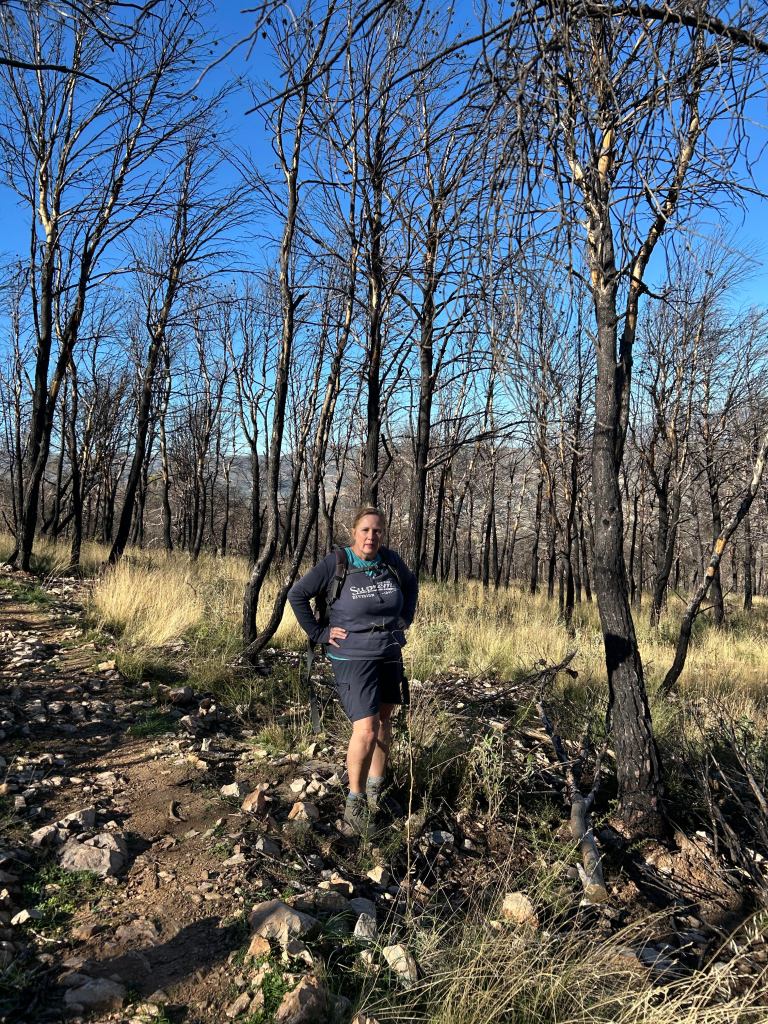 Gaandeweg ging het bos waar het pad door liep, over in een verbrand bos. De stammen waren zwart geblakerd, de toppen dood. De bosbranden van 2022 in de Lecrínvallei laten nog altijd over duizenden hectaren hun sporen na. Op de bodem schoten wel al nieuwe scheuten de zon tegemoet. In het opkomend struikgewas was het leven weer begonnen.