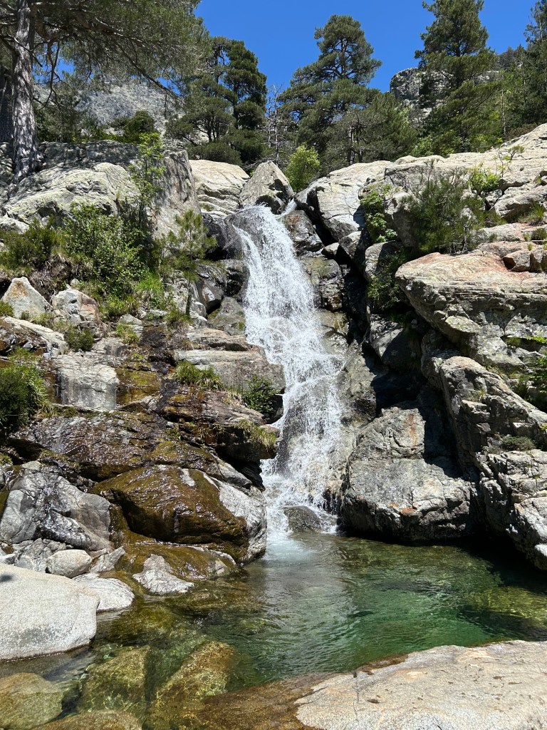 Tijdens die steile en zware afdaling struikelde ik enkele honderden meters voor de voetgangersbrug over het riviertje de Agnone. Ik viel met mijn scheenbeen op een scherpe steen die wat hoger dan de andere rotsige stenen op het pad uitstak. Even vreesde ik dat mijn scheenbeen gebroken was, maar gelukkig heb ik blijkbaar sterke beenderen. De wond bloedde wat, maar na vijf minuutjes op mijn tanden bijten, kon ik weer mee met mijn dochters en onze toenmalige Franse wandelvrienden Romain en Julie. Op een latere korte hike met Ziggy en Sigrid passeerde ik op de afdaling naar Vizzavona nog eens langs die watervallen, de beroemde Cascades des Anglais.