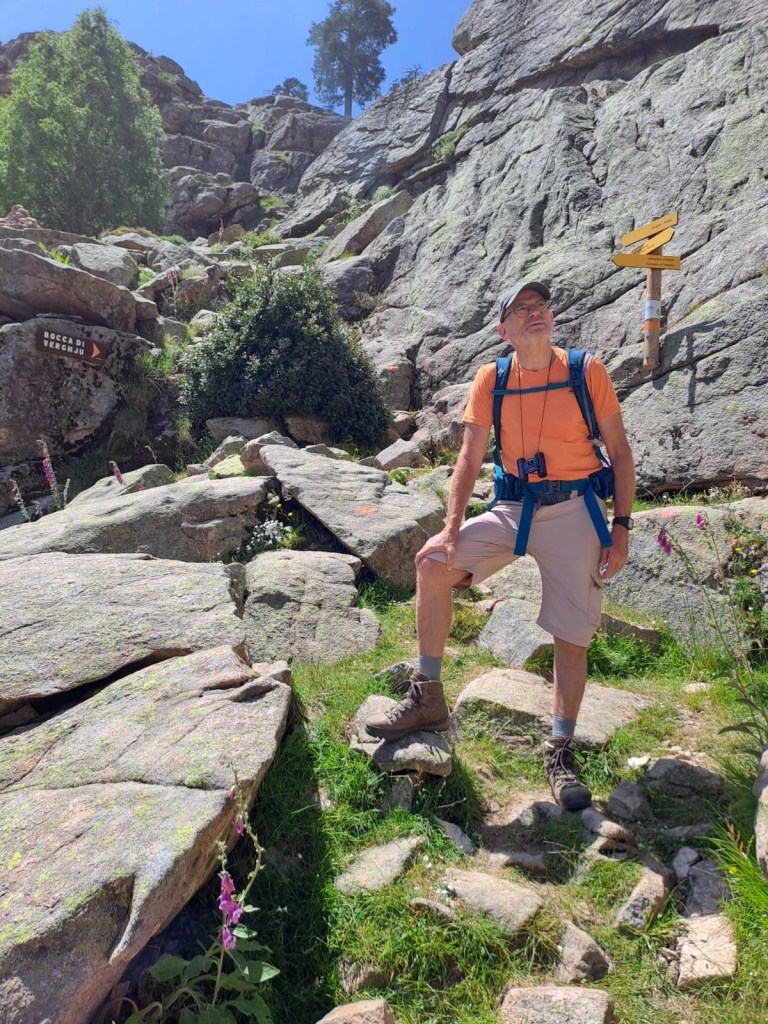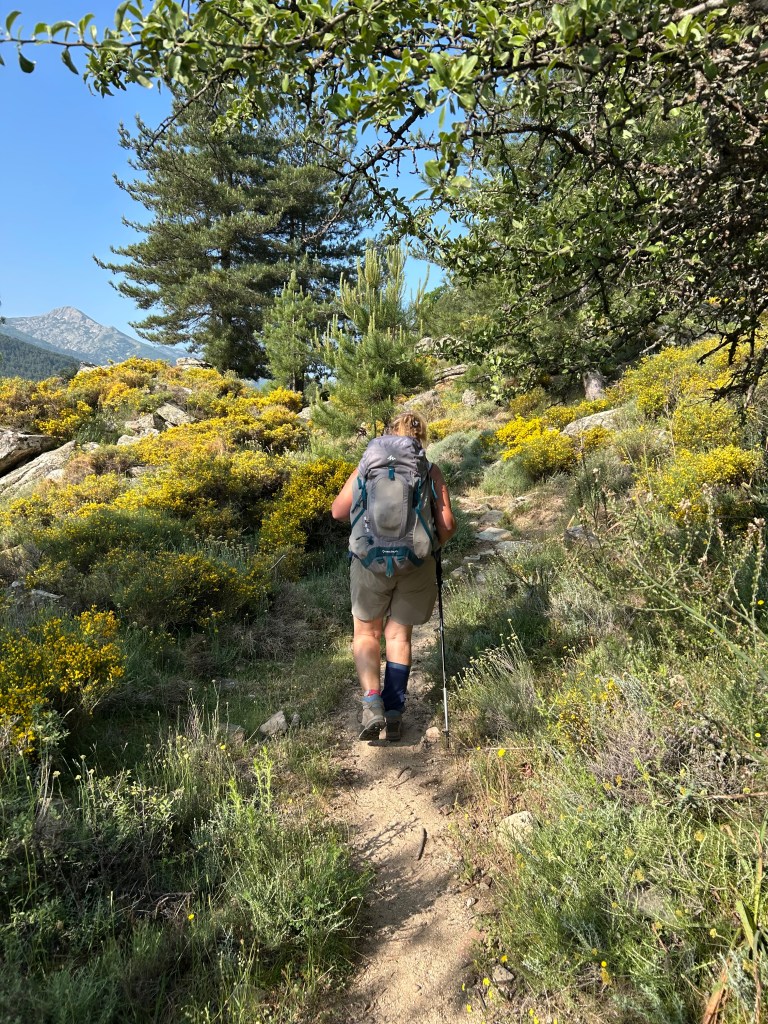 Aan een bocht in het pad waar van de bergkam een riviertje vrolijk naar beneden klatert, nemen we plaats op twee droge rotsen die boven het water uitsteken. We smikkelen van onze heerlijke picknick. Dan volgen we het pad verder omhoog, nu eens tussen struiken en de bloemenpracht van een heerlijke junizon, dan weer in pijnboombossen waar het pad op bomen en rotsblokken goed gemarkeerd blijft.