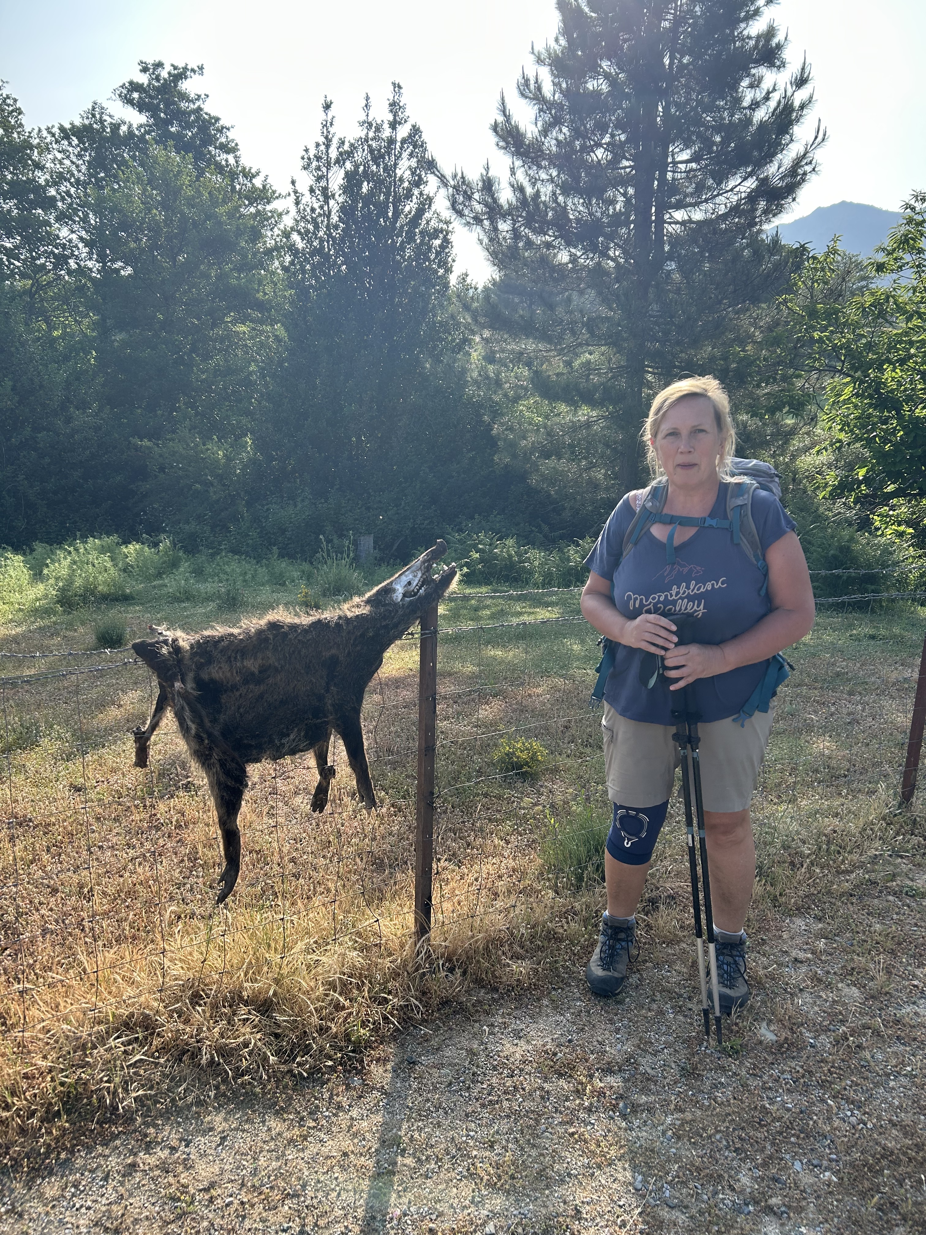 Dan is het tijd om langs de baan naar de Col de Verghio te stappen, waar een standbeeld staat, een ruime parking ligt, wegwijzers wandelingen aanwijzen, wat zwarte varkens rondscharrelen en een cafeetje z’n deuren en terras al geopend heeft. We verbruiken er een drankje. Van op de Col de Verghio loopt ook, oranje gemarkeerd, de Mare a Mare Nord naar Evisa, de tocht die we morgen zullen aanvatten.