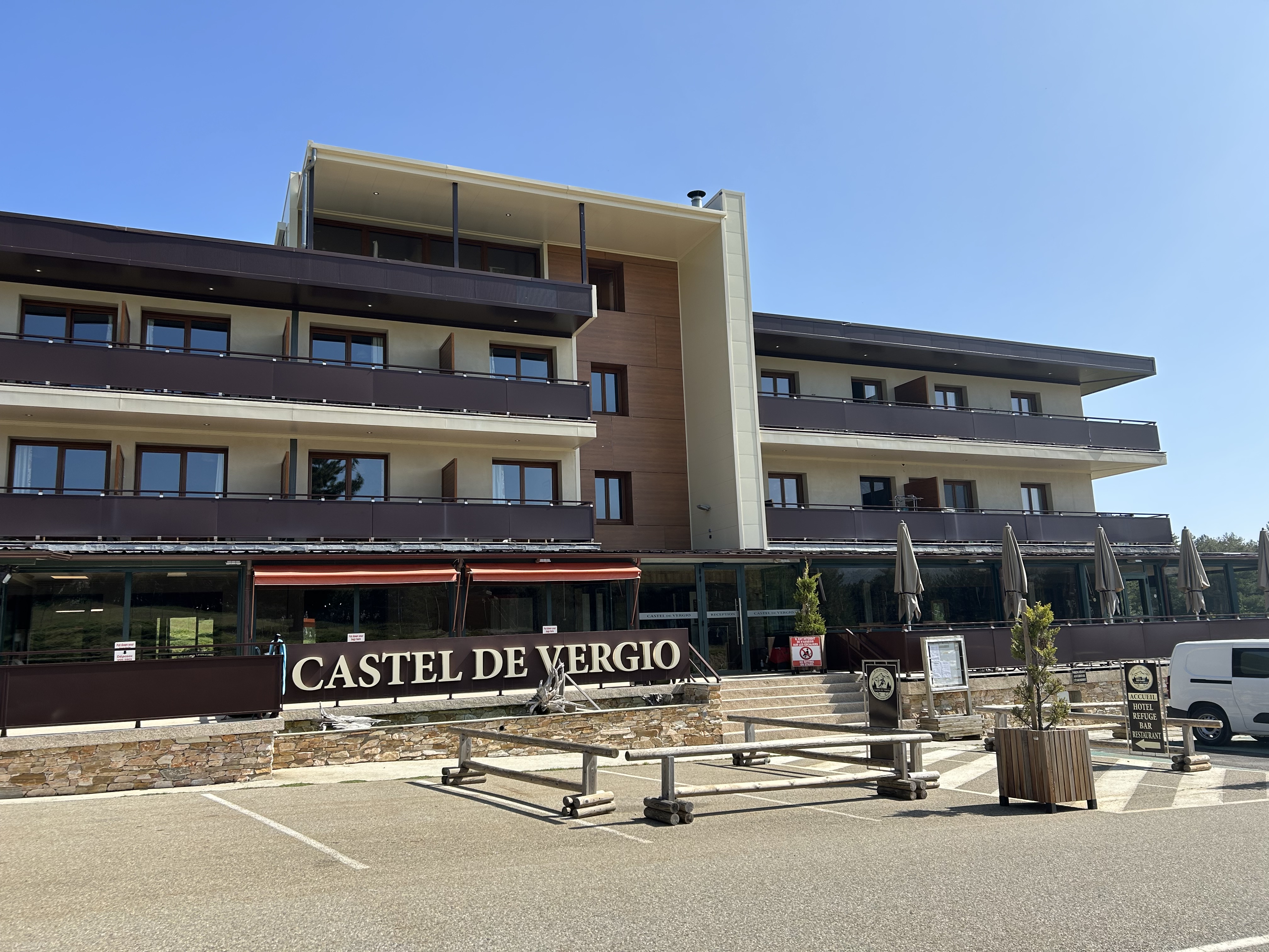 Die weg naar de col moeten wij echter niet nemen, want de col ligt nog zo’n anderhalve kilometer verwijderd van het hotel waar we de twee volgende nachten zullen verblijven. Aan een volgende richtingwijzer zien we dat de Mare a Mare-route die we volgen vanaf hier gelijk loopt met de GR20. We hebben nog twee en een halve kilometer te wandelen op de GR20. Uiteindelijk sturen de wegwijzers ons het bos uit. We komen op een brede baan met twee rijstroken. Enkele honderden meters verder zien we links al het hotel Castel de Verghio liggen. Dat hotel herbergt nauwelijks toeristen die er langer dan één nacht verblijven, zoals wij.