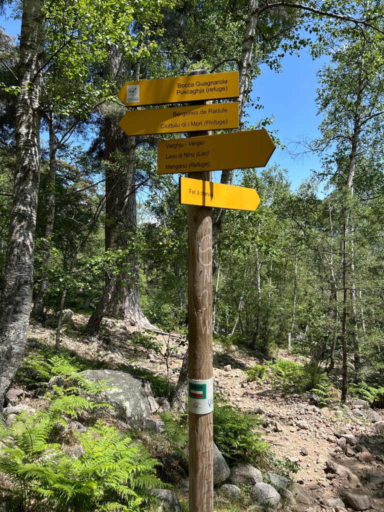 Van onder de pijnbomen komen we enkele kilometers verder in een berkenbos. Het valt op dat er ons meer wandelaars tegemoetkomen. Zij dragen echter geen rugzakken zoals wij, ze doen gewoon een boswandelingetje, op sneakers en met hoogstens een handtas of klein rugzakje als ballast. De paden zijn hier ook niet alleen met strepen gemarkeerd. Hier en daar staan grote palen met wegwijzers, naar verschillende bestemmingen. Col de Verghio kan niet ver meer zijn, schatten we in. Ik tel de laatste klimmeters die veel langer lijken dan gedacht, maar uiteindelijk vinden we toch op een paal de wegwijzer die de wandelaars naar de Col de Verghio voert, het midden tussen twee bergen in.