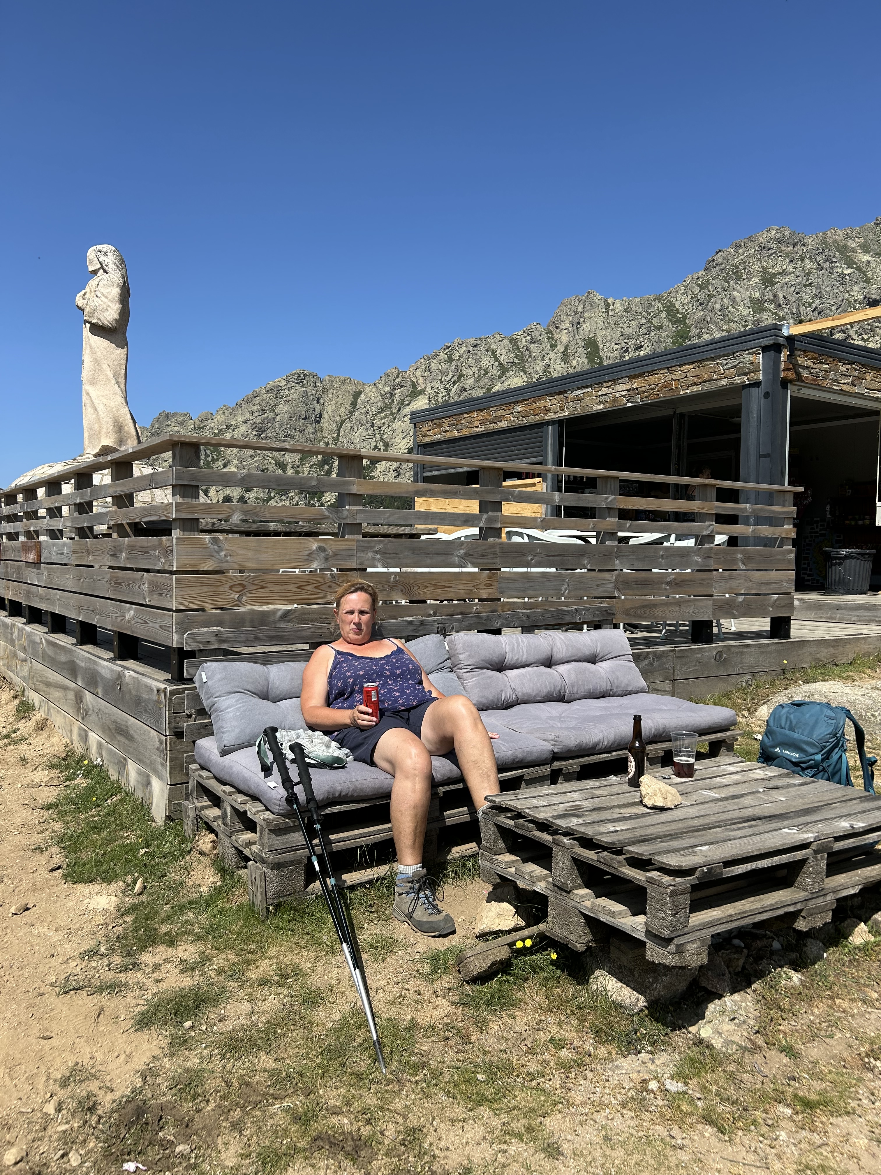 Vandaag volgen we de wegwijzers naar de refuge van Manganu, maar zo ver gaan we natuurlijk niet stappen. We gaan op ons gemak naar de Bergerie E Radule. Na een tijdje lopen we het berkenbos uit en komen we op het GR20-pad in de bergen, waar Marianne kennismaakt met het bergpad vol scherpe en los liggende stenen. We zien de Bergerie al van ver liggen. Twee vriendelijke vrouwen staan er achter de toonbank. Rond de Bergerie staan nog stallingen, schuurtjes en andere bijgebouwen, zelfs een tentzeil om de trekkers te beschermen tegen de zon. Je kan er dranken kopen, kazen en zelfs een maaltijd krijgen.