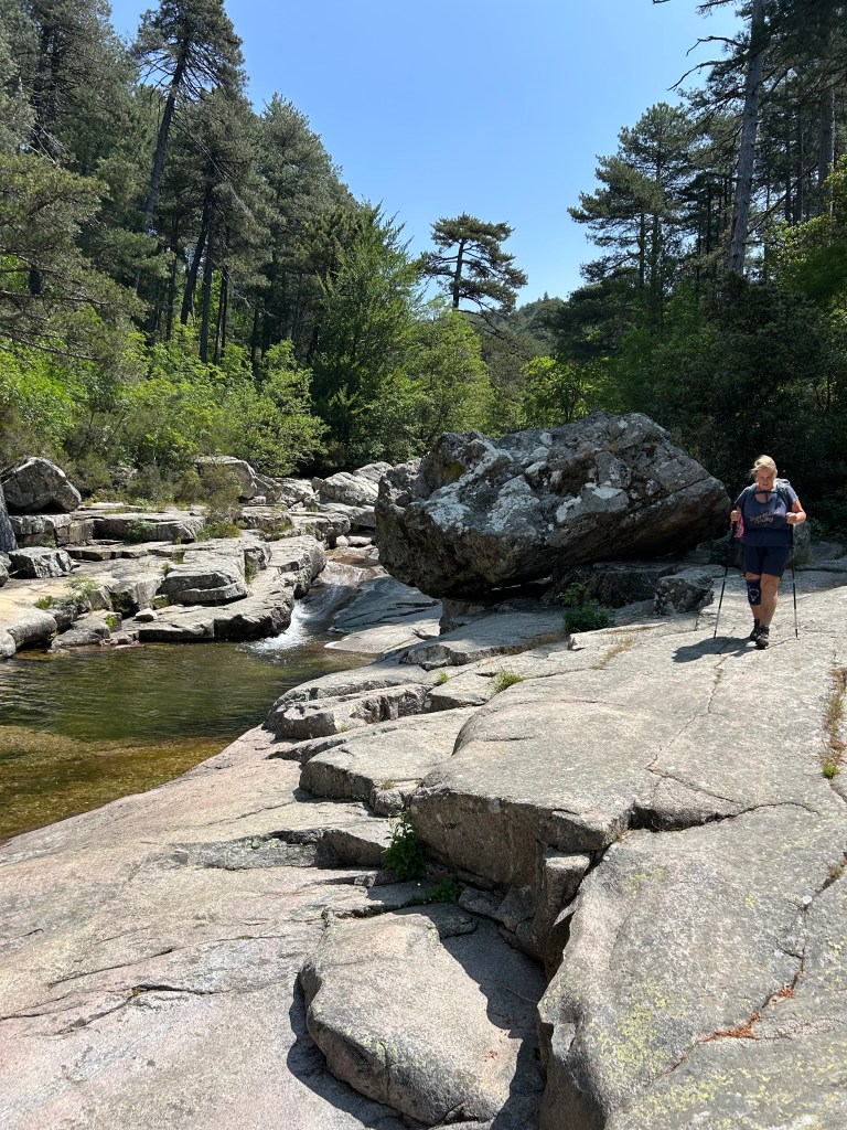 Het is zondag 7 juni als we terug gelaarsd en gespoord Castel di Verghio verlaten voor onze volgende bestemming: Evisa. Ook deze wandeling langs de Mare a Mare is geen kattenpis. In afstand is de etappe niet zo ver, ongeveer 12 kilometers. Maar de zwaarte van de wandeling zit vooral in het vrij hoge aantal daalmeters, 811, tegenover 246 stijgmeters. Vooral voor Marianne zal het vele dalen de tocht weer zwaar maken. Na een half uur wandelen en voorzichtig afdalen in een prachtig bos van magistrale laricio-dennen, komen we op een breder pad dat langs de bergflank slingert. Het brede pad daalt gezapig tot aan de brug van Casterica, waarna we weer wat steiler verder dalen langs een beekje.