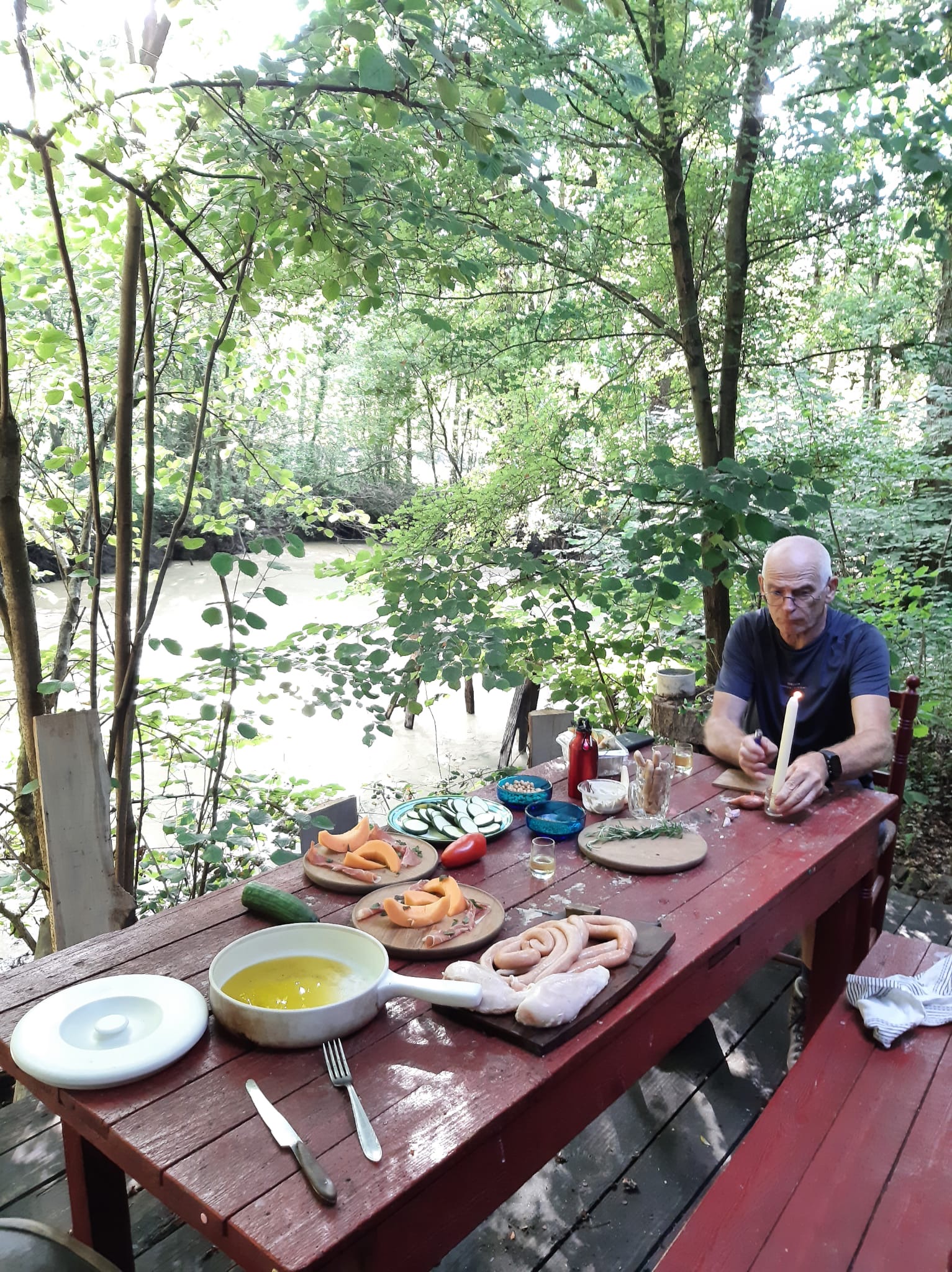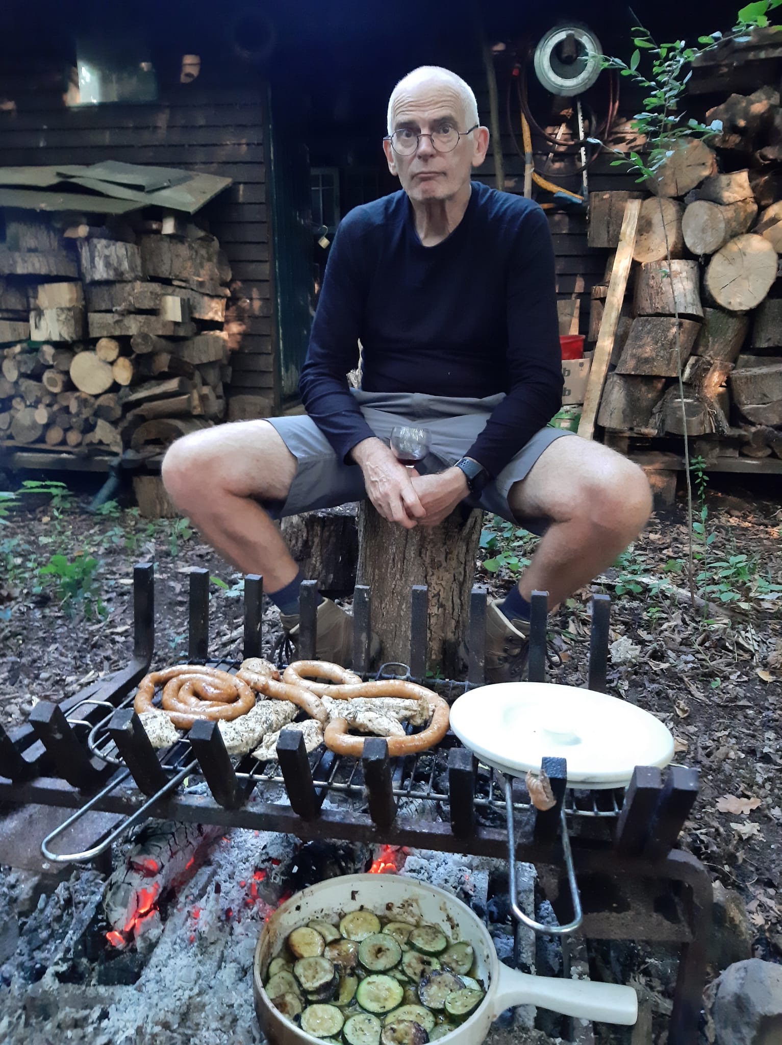 Na de exploratie van het toilet begint Ward het voorgerecht klaar te maken, meloen met parmaham. Terwijl mijn vriend ons diner voorbereidt, beginnen we stilletjes aan de jenever van passievruchten op te drinken. Daarbij serveert Ward ons voorgerecht op houten borden. Hij heeft ook nog een boel vlees mee om te braden op de barbecue. Het is mijn taak om het vuur aan te steken en voldoende houtskool te maken om het vlees goudbruin te bakken. Dat lukt me aardig, er ligt voldoende droog aanmaakhout. We gooien er enkele dikke houtblokken bij en na nog een tijdje aperitieven proeven we de rode wijnen.