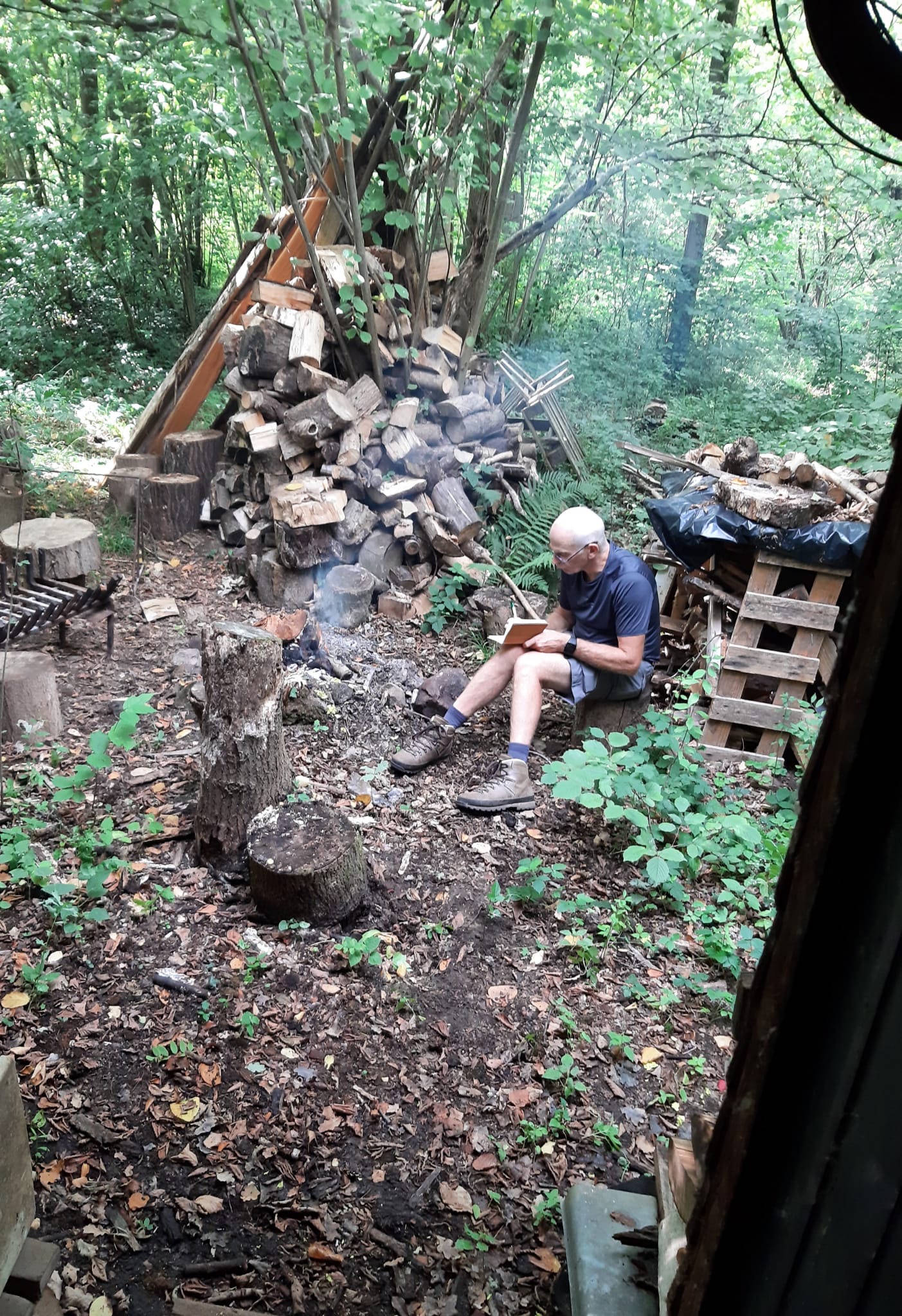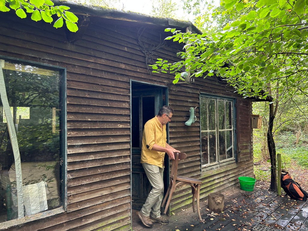 De boshut waar we een nachtje zullen verblijven, heeft al een lange geschiedenis achter de rug. De hut werd gebouwd door de vader van Ward en een goede vriend, vermoedelijk in de jaren zeventig. Ze trokken zich er regelmatig met nog andere vrienden terug om te schaken of te kaarten. De houten wanden van de hut zijn getooid met de affiches van Lineart, een kunstbeurs die Ward jaren geleden mee organiseerde.