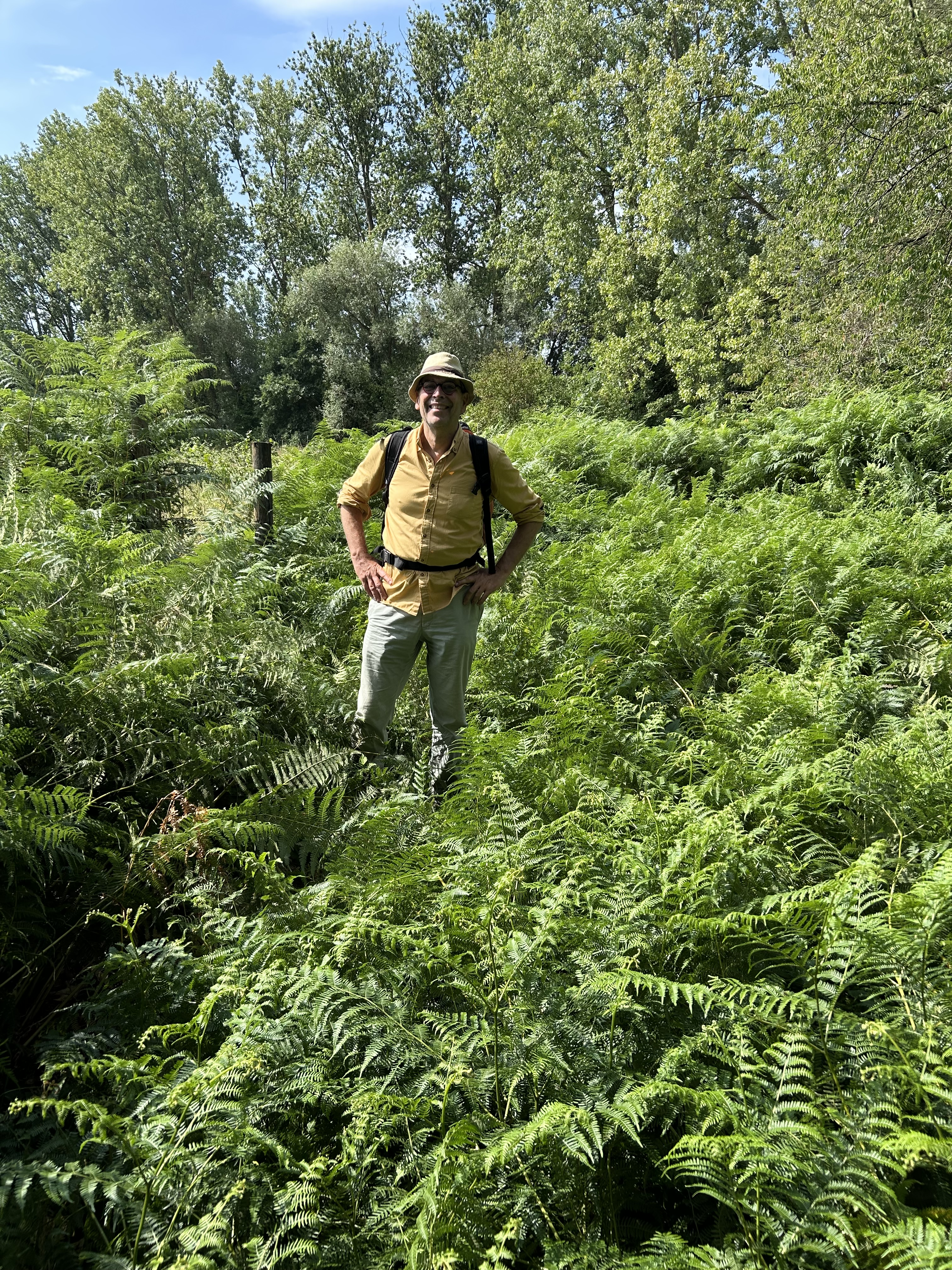 Als alles netjes opgeruimd en ingepakt is, verlaten we de boshut en beginnen we onze terugreis, opnieuw een kilometer of vijftien wandelen. De wandeling begint onder een stralende zon. We lopen aanvankelijk langs een deel van het parcours van de stamdropping van twee jaar geleden, die in Holsbeek langs de Chartreuzeberg en het kasteel van Horst liep. Maar nu wenden we de steven naar de andere richting, langs de weiden, bossen en velden waar Ward nog wat familie heeft wonen, naar de brug over de autosnelweg. Kort daarna slaan we rechts een overwoekerd pad in dat ons door manshoge varenpartijen tot in het Wingepark brengt.