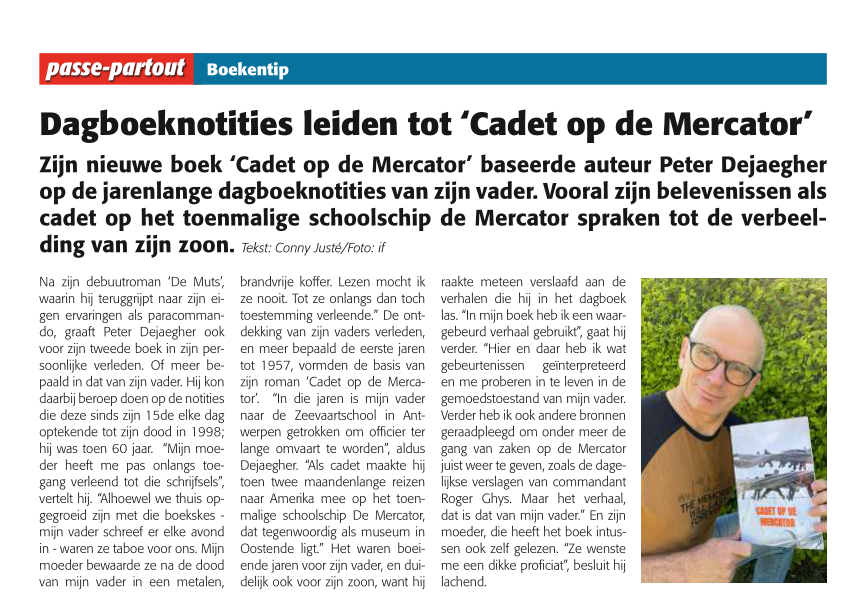 Ter gelegenheid van “Oostende voor anker” kreeg ik van de verantwoordelijken voor het museumschip Mercator de kans om “Cadet op de Mercator” te signeren op de barkentijn. Een kans die ik met beide handen greep. Ik zal op de Mercator zitten zaterdag 21 en zondag 22 mei van 11 tot 16 u, zolang mijn voorraad boeken strekt. Vooral zondag 22 mei wordt een spannende dag. Moest mijn vader nog geleefd hebben, hij zou die dag 85 zijn geworden, vijf jaar jonger dan de Mercator zelf.